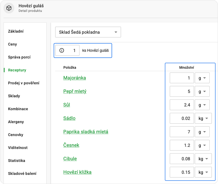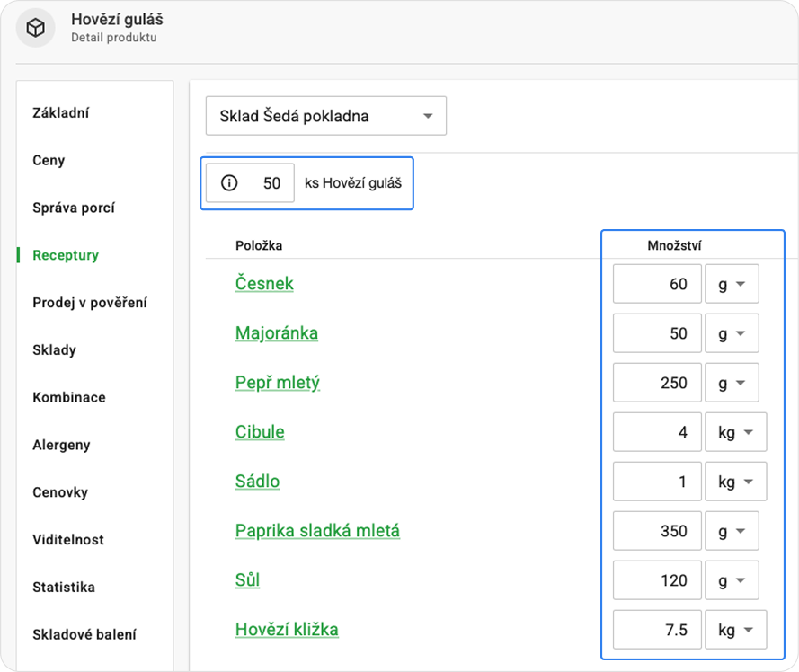 Do produktu s recepturou vyplňte do nového pole počet porcí a do receptury zadejte množství ingrediencí z receptu. Např. v receptuře na 50 porcí guláše potřebujete: 7.5 kg hovězího masa, 4 kg cibule, 1 kg sádla… atd.