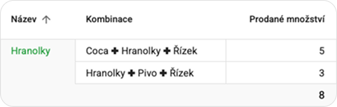 Používáte kombinace? A víte, kolik hranolek jste prodali v jaké kombinaci? Dozvíte se to v nové sestavě Prodané produkty včetně kombinací. Ukáže vám, jak se jednotlivé varianty prodávají – třeba 3x Řízek + Hranolky + Cola a 5x Řízek + Hranolky + Pivo. Snadno tak uvidíte, co u vás letí a nabídku podle toho přizpůsobíte.